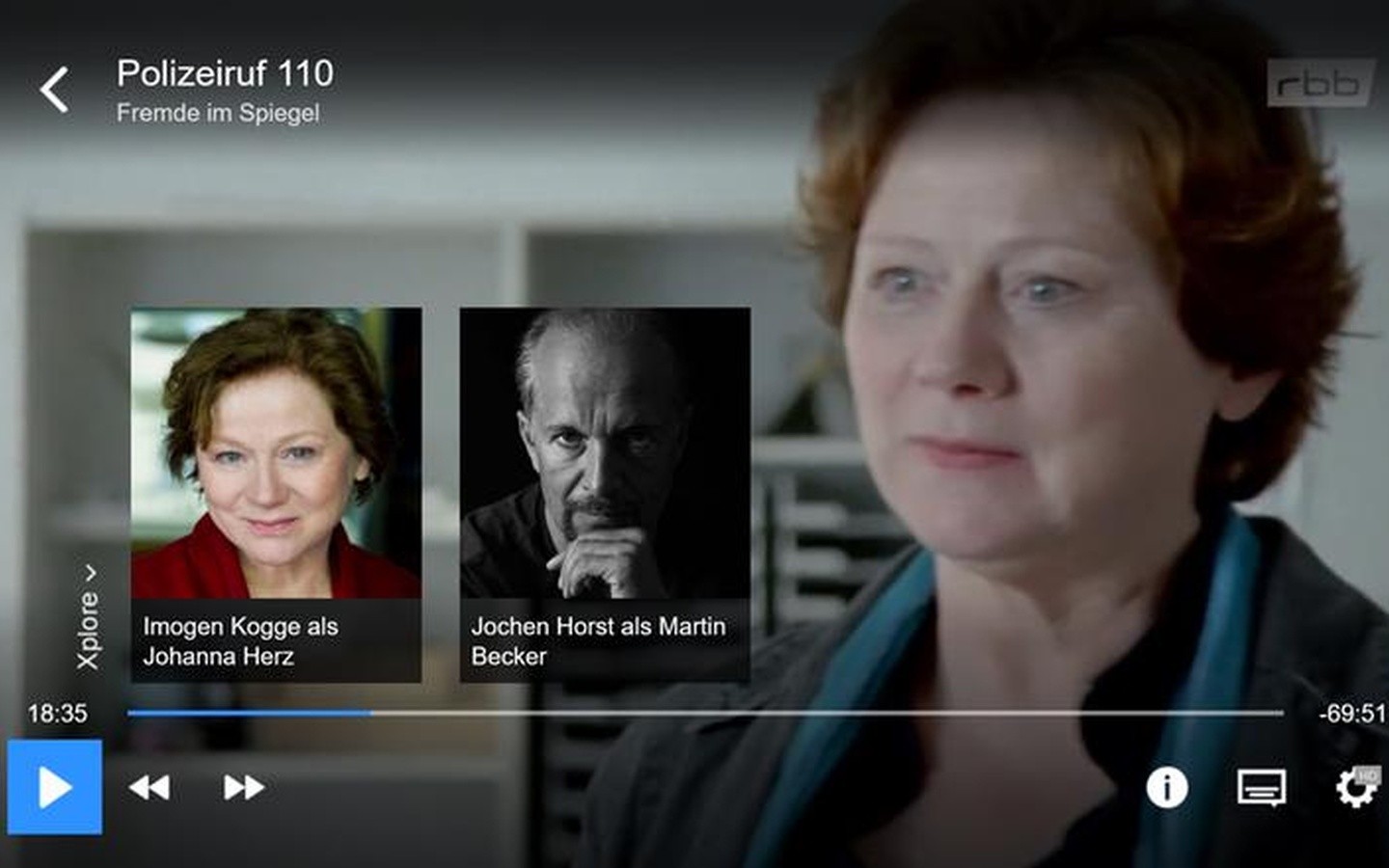 Jay, which is part of Transfermedia, provides what they call ‘layers of content for audiences’. During the 27th of October episode of Polizeiruf 110 "Der Fremde im Spiegel", viewers got their first chance to use the ‘Xplore’ widget, in the ARD start application for HbbTV. While the episode is paused, images of the actors starring in the scene and the current location featured, are listed on-screen with more information. At the end of the episode, the information for all of the actors from the entire episode and all of the locations featured throughout, can be asked once again.